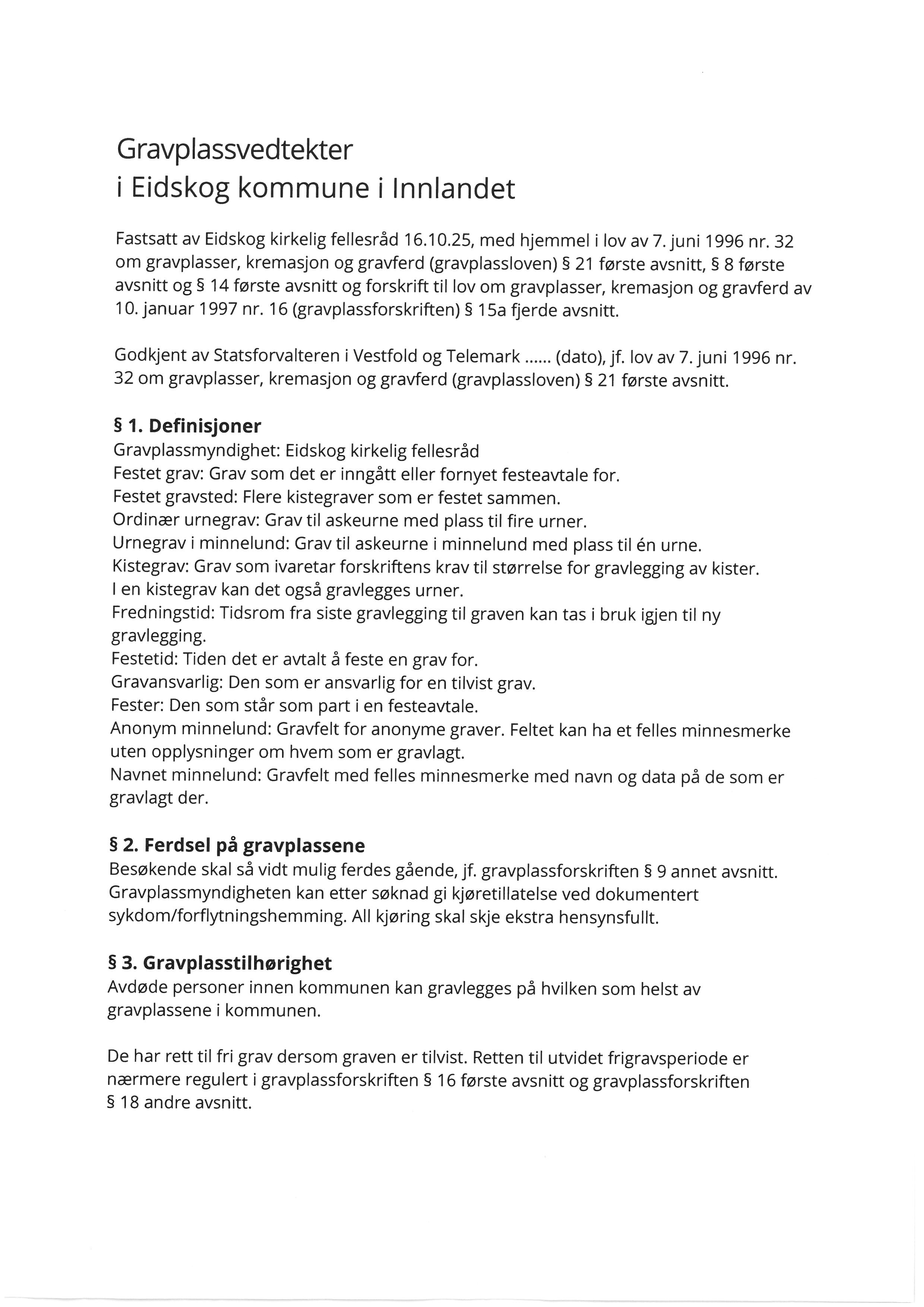 Det er nye krav til kirkegårdsvedtekter. Vedlagt er Fellesrådets forslag? Hva tenker du?